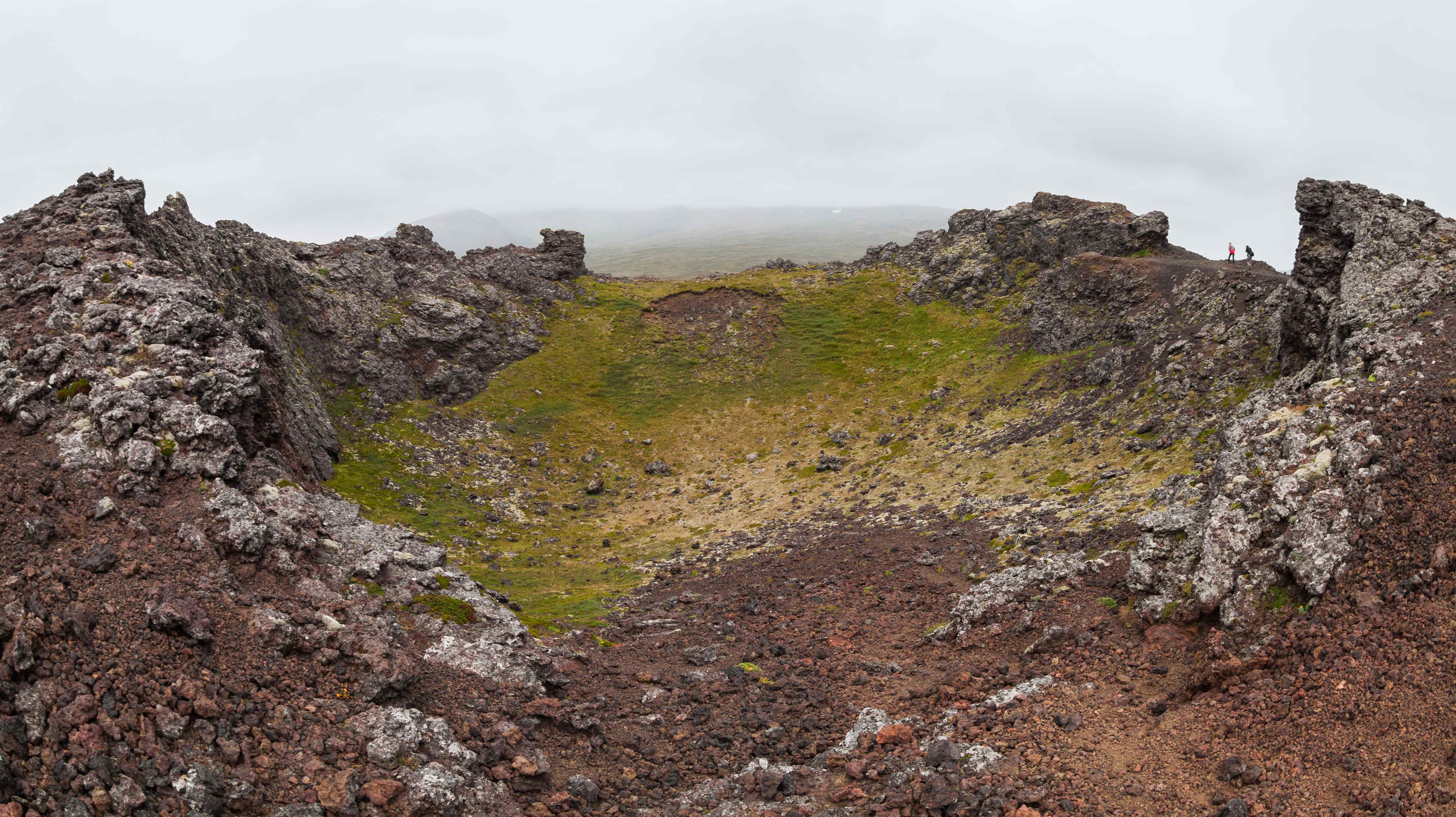 The crater is about 100 meters in diameter and showcases the area's volcanic history. The red and orange volcanic rock creates a stark contrast with the green moss that covers much of the surrounding landscape. On clear days, you can see Snaefellsjokull Glacier from the summit.